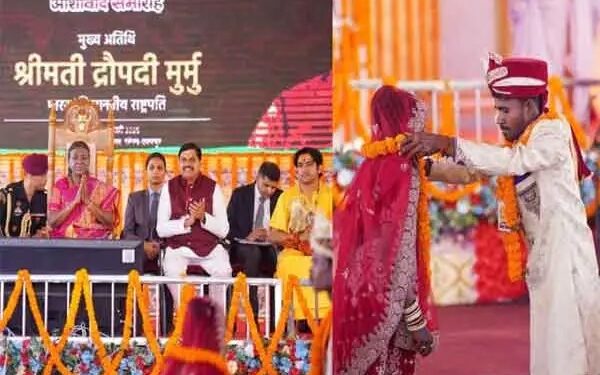 Bhopal: A grand mass wedding ceremony was held at Bageshwar Dham in Chhatarpur, Madhya Pradesh, on Wednesday, where 251 couples were united in matrimony in the presence of President Droupadi Murmu, Governor Mangubhai Patel, and Chief Minister Mohan Yadav. CM Yadav announced a gift of ₹51,000 for each newlywed couple and congratulated them, saying that they have become the embodiment of Goddess Parvati and Lord Shiva on the auspicious occasion of Mahashivratri.